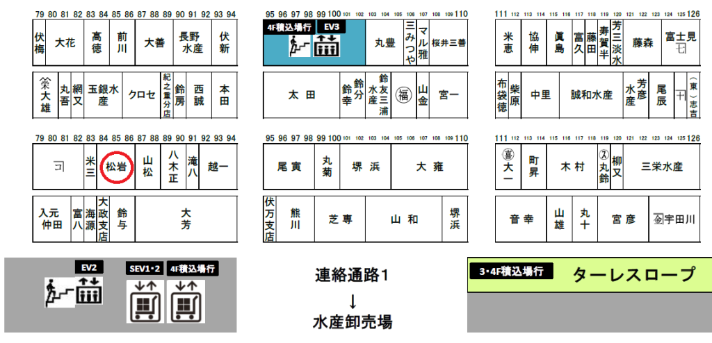 最新情報は東京魚市場卸協同組合サイトの【店舗配置図】水産仲卸店舗配置図(ダウンロード可能)よりPDFファイルをご確認ください。